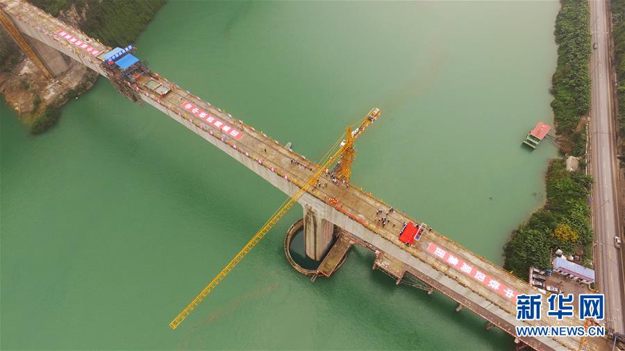 在重慶涪陵拍攝的渝懷鐵路涪秀二線重點(diǎn)工程——烏江右線大橋(10月23日無(wú)人機(jī)拍攝)。 10月23日,由中鐵四局承建的渝懷鐵路涪秀二線重點(diǎn)工程——烏江右線大橋主跨成功合龍,標(biāo)志著大橋主體工程全部順利結(jié)束。烏江右線大橋項(xiàng)目全程460.1米,主跨192米,跨越烏江和319國(guó)道。在兩年多的建設(shè)過(guò)程中,施工人員攻克了“不等高墩”“不對(duì)稱邊跨”“邊跨入隧”等多個(gè)技術(shù)難題。 新華社記者王全超攝