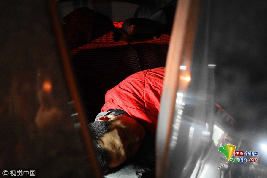 2018年11月17日,北京,由于醫(yī)院只允許一名家長陪護,醫(yī)院門口的日租房又很貴,袁東方不舍得花錢,只好借住在病友的車內(nèi)。魏建順/視覺中國