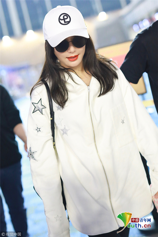 11月29日,上海,秦嵐現(xiàn)身機場。她戴白色鴨舌帽,穿白色星星圖案外套配微喇牛仔褲,架黑超涂紅唇笑靨如花。
