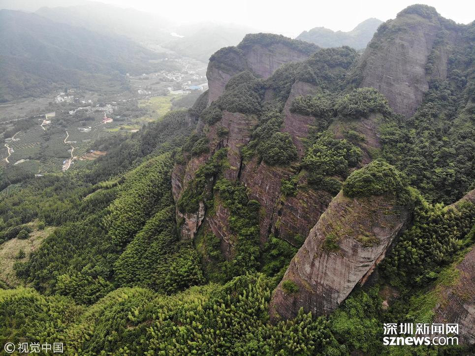 航拍位于贛粵兩省交界處的江西南武當山。 南武當山擁有99座千姿百態(tài)的巍峨石峰,丹霞地質(zhì)風貌突出,連綿十里,被稱為“武當十里畫廊”。
