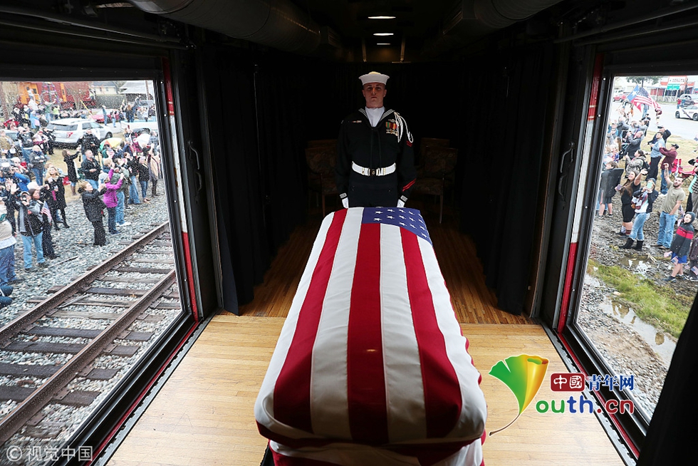 當(dāng)?shù)貢r間2018年12月6日,美國德州,美國前總統(tǒng)老布什將落葬德州農(nóng)機大學(xué)布什總統(tǒng)圖書館和博物館后面的布什家族墓地,與他半年前去世的妻子芭芭拉以及早夭的女兒蘿賓葬在一起。當(dāng)天,一輛葬禮專列將載著老布什的棺槨及其親朋,從休斯敦郊區(qū)開往老布什的最后安葬之地、德州農(nóng)機大學(xué)。這列火車的第六節(jié)車廂側(cè)面是透明的,人們可以在鐵軌旁看到老布什蓋著國旗的靈樞。圖片作者:Joe Raedle/視覺中國