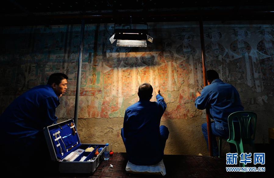 技術(shù)人員在莫高窟內(nèi)對病害壁畫進行修復(fù)(2014年9月3日攝)。 敦煌記錄歷史。開放的胸襟,曾讓這里成為古代絲綢之路上“華戎所交一都會”。 時隔千年,改革開放的春風(fēng)吹入西北內(nèi)陸小城,敦煌再度成為中國對外開放的文化前沿。 新華社記者 陳斌 攝