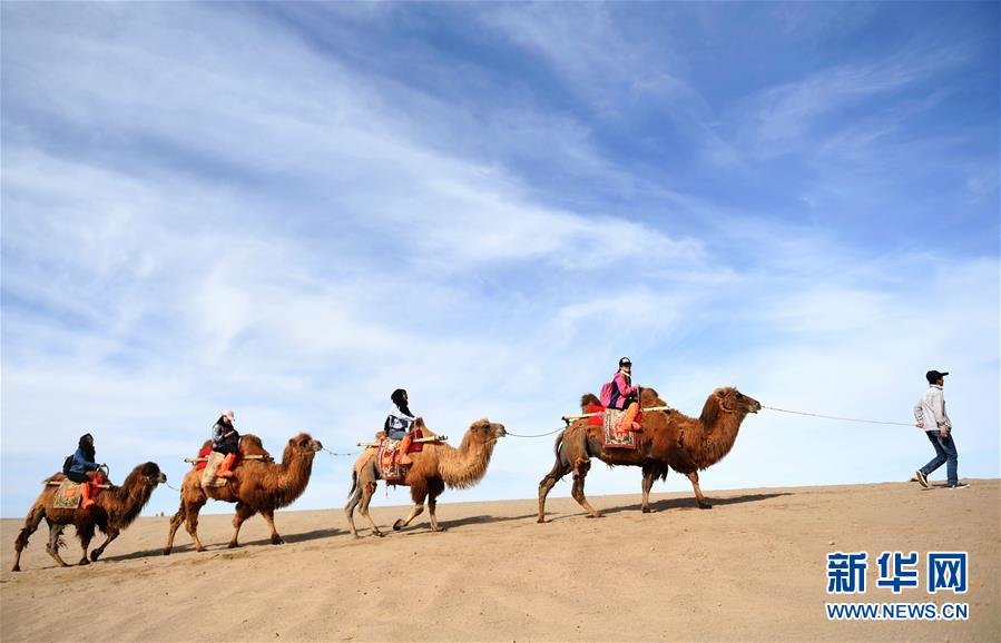 游客在敦煌鳴沙山騎駱駝(2017年5月3日攝)。 敦煌記錄歷史。開放的胸襟,曾讓這里成為古代絲綢之路上“華戎所交一都會”。 時隔千年,改革開放的春風(fēng)吹入西北內(nèi)陸小城,敦煌再度成為中國對外開放的文化前沿。 新華社記者 陳斌 攝