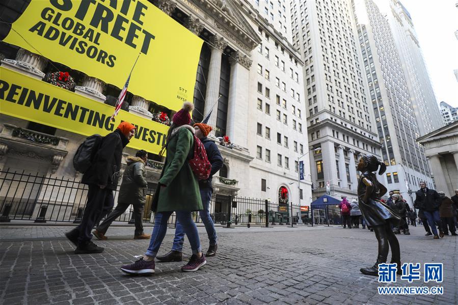 這是12月10日在美國紐約證券交易所前拍攝的“無畏女孩”銅像。 新華社記者 王迎 攝