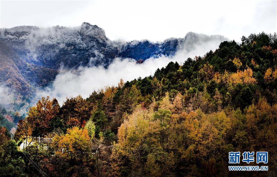 鬼谷嶺國家森林公園山頂白雪覆蓋,半山卻是一派秋色(11月8日拍攝)。 新華社記者陶明攝