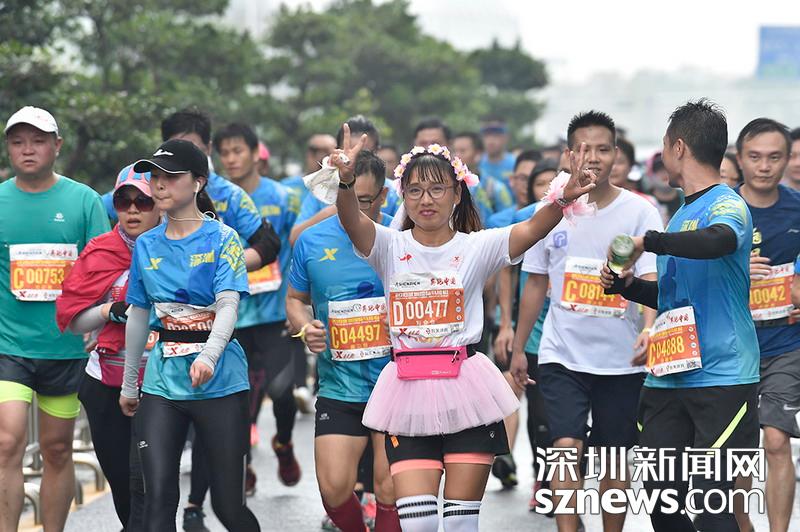 2018年12月16日,深圳國際馬拉松位于后海的折返點,一名選手正在向終點沖刺,并向鏡頭招手。