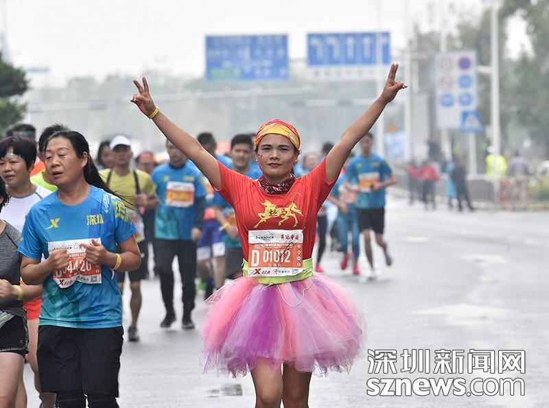 2018年12月16日,深圳國際馬拉松位于后海的折返點,即將抵達終點,一名選手擺出勝利姿勢。