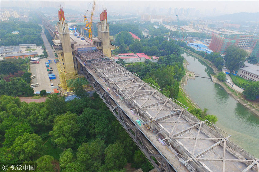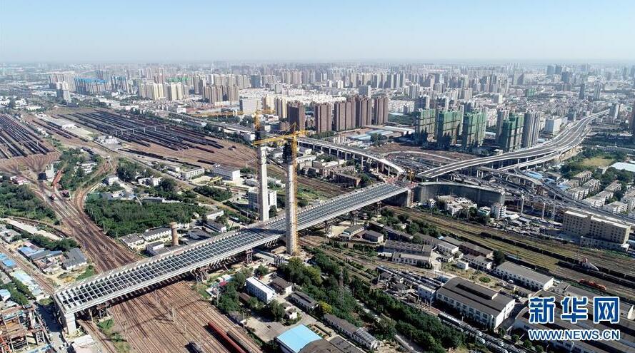 9月7日無人機拍攝的鄭北大橋鋼梁頂推施工現(xiàn)場。當(dāng)日,跨越鄭州北站的鄭北大橋鋼梁頂推成功。鄭北大橋是東西走向的鄭州市農(nóng)業(yè)路快速通道工程的一部分,需跨越鄭州北站。由于列車不能中斷運行,鄭北大橋不能采用常見的搭腳手架方式施工,而是采用頂推法,即在大橋一端把橋身拼接好,然后一段一段朝著鐵路編組站上方送過去,最終完成橋梁架設(shè)。新華社記者朱祥攝