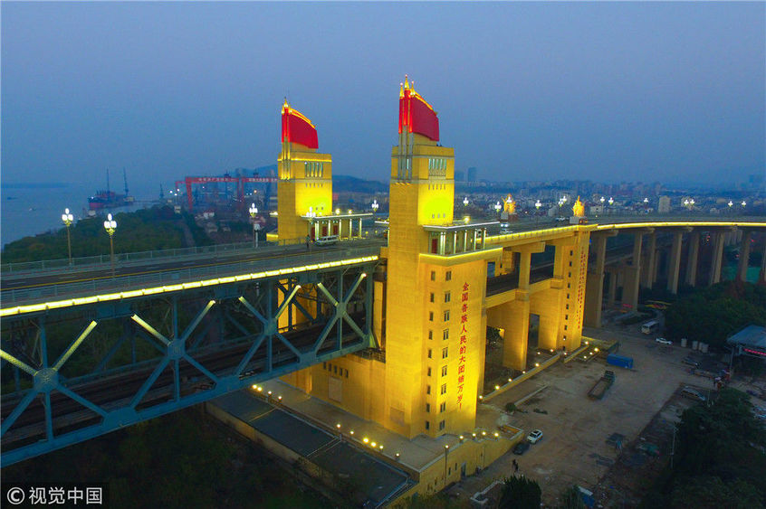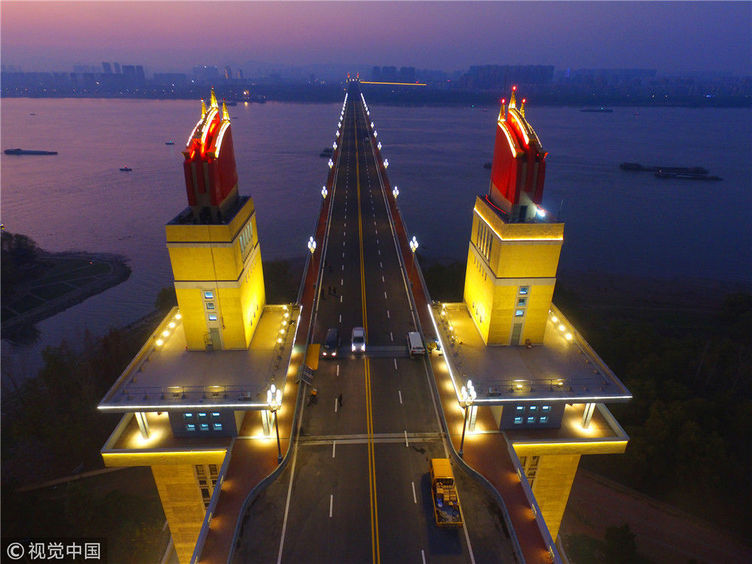 2018年12月13日,江蘇南京,“一橋飛架南北,天塹變通途?!弊鳛槲覈谝蛔孕性O(shè)計和建造的雙層鐵路、公路兩用橋,南京長江大橋在我國橋梁史上的重要地位不言而喻。從1968年建成后的48年間,它就如同一條巨龍,始終在長江上默默守護著人來車往。南京長江大橋上層是公路橋,下層為雙軌復(fù)線鐵路橋,連接津浦鐵路與滬寧鐵路干線,是我國南北交通要津和命脈。近年來,由于南京長江大橋公路橋的實際通行荷載遠超原先設(shè)計標準,不僅橋面上擁堵常現(xiàn),橋梁本身的種種“病害”也日益加深。圖為2018年12月13日,夜幕降臨,南京長江大橋歸位后的玉蘭花燈重新點亮。大橋玉蘭花燈柱共有299根,每根燈柱上有5盞玉蘭花燈,1大4小,一共1495盞。方東旭/視覺中國