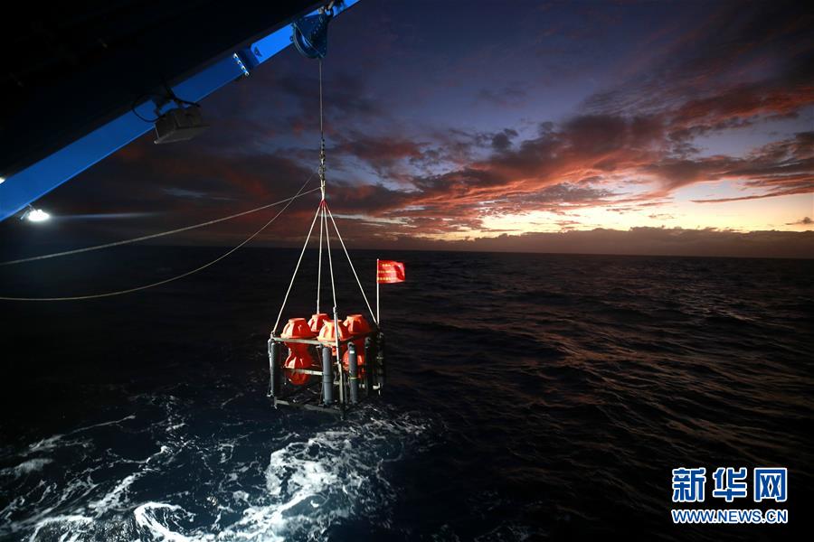 考察隊(duì)員在馬里亞納海溝“挑戰(zhàn)者深淵”海域布放“彩虹魚”著陸器(12月14日攝)。