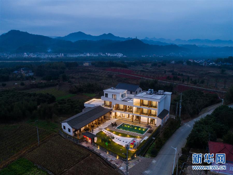 12月19日,空中俯瞰夜色中的民宿“初憶小院”(無人機(jī)拍攝)。該民宿是河橋鎮(zhèn)“90后”女孩章淑貞開辦的,民宿融入了大量的現(xiàn)代建筑設(shè)計(jì)風(fēng)格,深受年輕人的喜愛。 新華社記者 徐昱 攝