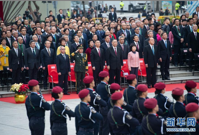 12月20日,澳門特區(qū)行政長官崔世安(前右三)、中央人民政府駐澳門聯(lián)絡辦公室副主任姚堅(前左三)、外交部駐澳門特別行政區(qū)特派員公署特派員沈蓓莉(前右二)等出席升旗儀式。新華社記者 張金加 攝