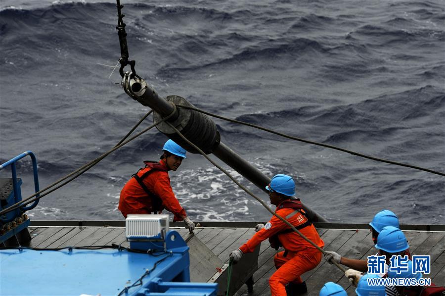 科考團(tuán)隊(duì)成員在船上布放重力柱(12月21日攝)。
