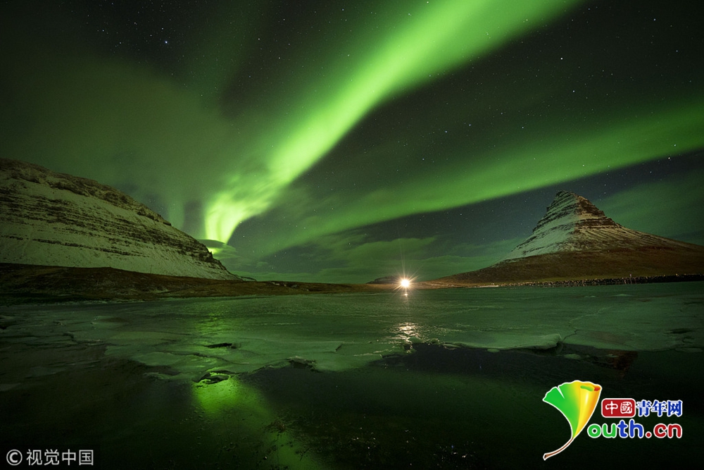 近日,冰島西海岸高463米的Kirkjufell山上空出現(xiàn)極光。