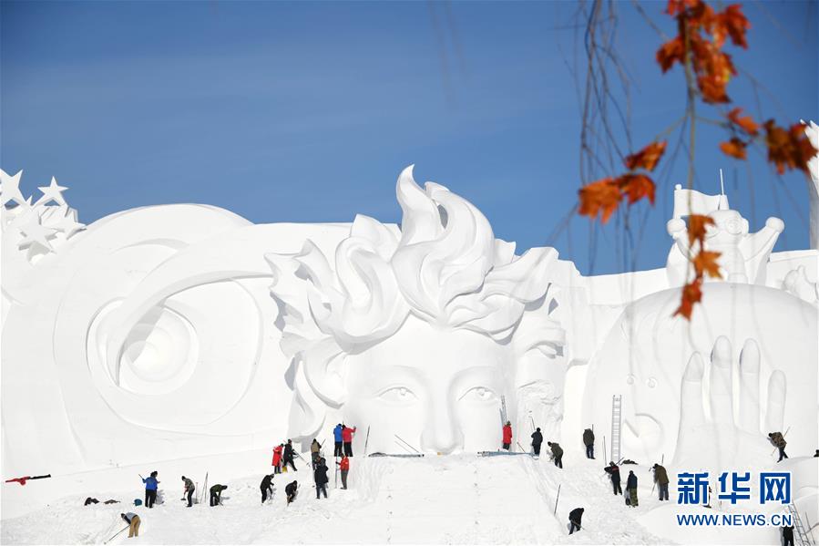 12月24日,雪雕師在制作太陽島雪博會主塑“星河之旅”。 當(dāng)日,哈爾濱太陽島雪博會主塑露出“芳容”。本屆雪博會主塑“星河之旅”長106米,高32米,寬20米,用雪量達(dá)4萬立方米。 新華社記者 王建威 攝