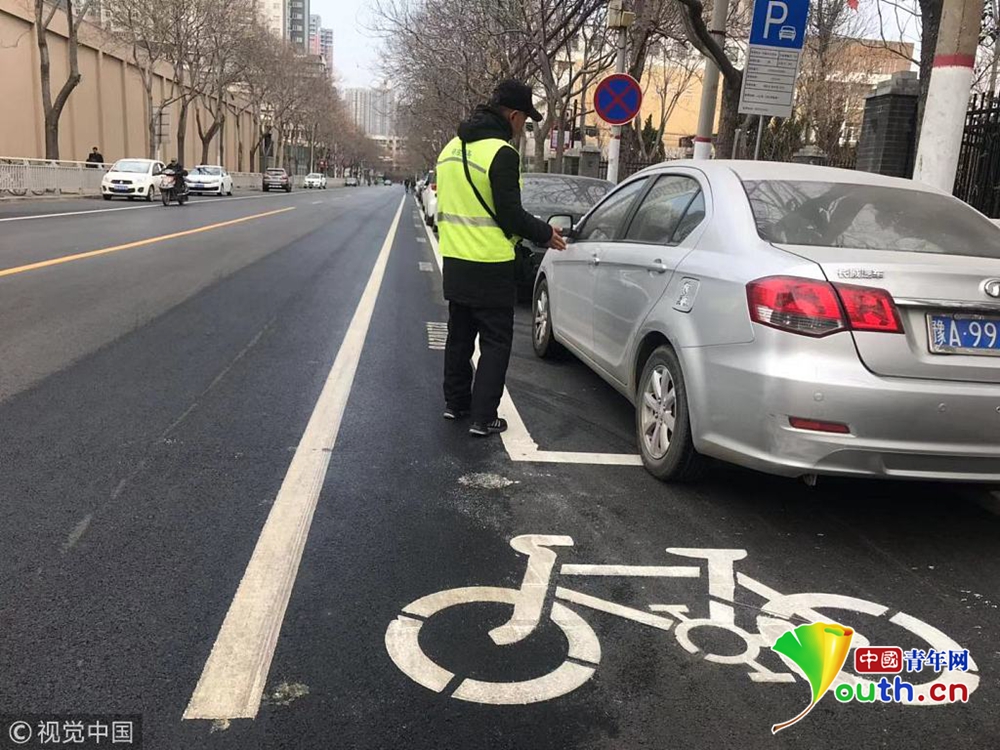 現(xiàn)場,文化宮路與友愛路口附近,新鋪好的路面被劃上了嶄新的行車線和停車位標(biāo)線。從文化宮路和友愛路交叉口向北,道路東側(cè)的非機動車道被停車位占去后,僅剩下0.8米左右的寬度。同樣在路口南側(cè),道路西側(cè)的非機動車道也被新劃的停車位占去,僅剩不足1米的寬度。