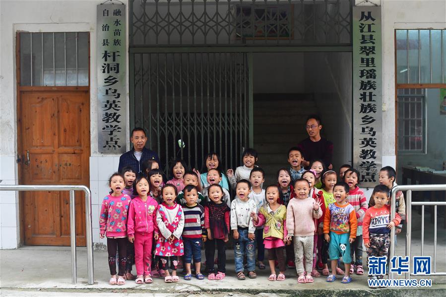 烏英教學點“一??鐑墒^(qū)”,目前有廣西籍學生18名,貴州籍學生9名,廣西貴州籍老師各1名。 烏英苗寨位于黔桂交界的大苗山深處,共有140戶,其中100戶屬廣西柳州市融水苗族自治縣桿洞鄉(xiāng)黨鳩村,40戶屬貴州省從江縣翠里瑤族壯族鄉(xiāng)南岑村。由于地處偏遠,山多地少,經濟發(fā)展緩慢,目前整個苗寨還有76戶是貧困戶。 面對艱巨的脫貧任務,當?shù)攸h委政府在努力改善烏英苗寨公共基礎設施的同時,因地制宜,帶動群眾積極發(fā)展特色產業(yè)。從2017年11月至今的一年多時間,這里發(fā)生了很大改變:10戶村民新建了木樓,120多戶完成“三改”(改廁改廚改圈),1名貧困考生考上大學,1戶購買新汽車,4對新人舉行了婚禮,寬帶網絡開始進入貧困戶家庭,苗寨修建了新的辦公大樓和戲臺,安裝了4盞太陽能路燈,購買了40多個新蘆笙,水果種植專業(yè)合作社2018年種植的百香果也開始有所收獲,18戶貧困戶進入脫貧公示階段…… 烏英苗寨600多名黔桂苗族群眾,正在用勤勞的手,拔窮根摘窮帽,一起創(chuàng)造美好的明天。