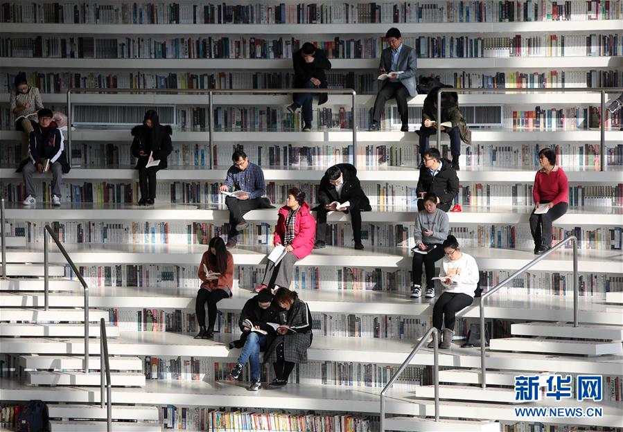 12月27日,讀者在天津濱海新區(qū)圖書館中庭的“書山”上看書。 濱海新區(qū)圖書館位于天津濱海文化中心,2017年10月1日正式開館,設計立意為“濱海之眼”和“書山有路勤為徑”。圖書館現(xiàn)有藏書60多萬冊,一年多來接待讀者約280萬人次,已成為濱海新區(qū)的文化“新地標”。 新華社記者伍婧丹攝