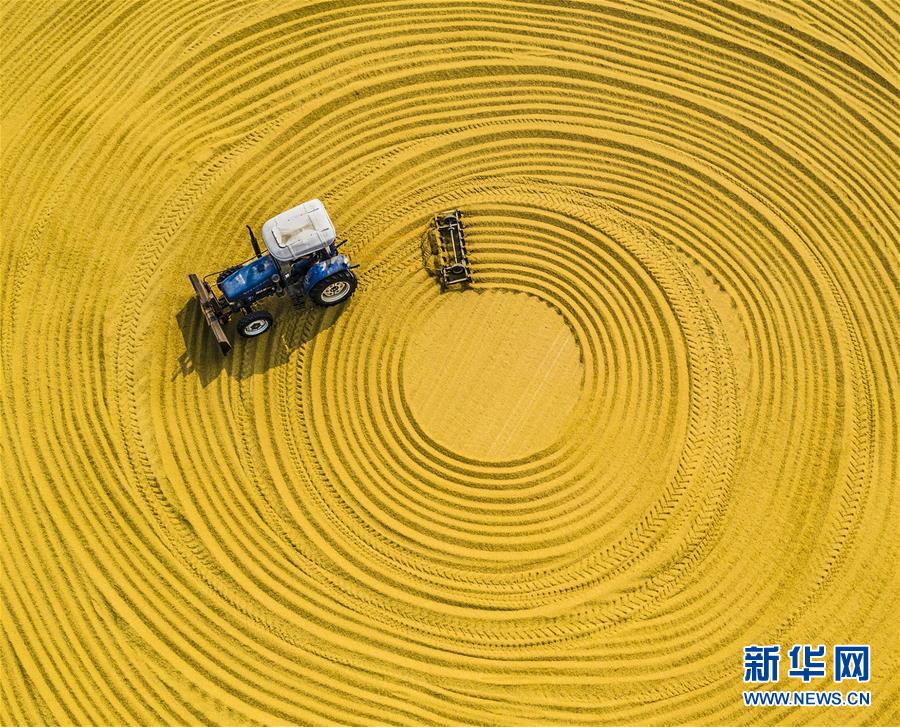 10月23日,在位于江蘇泗洪的洪澤湖農(nóng)場,一臺農(nóng)機在翻曬稻谷。