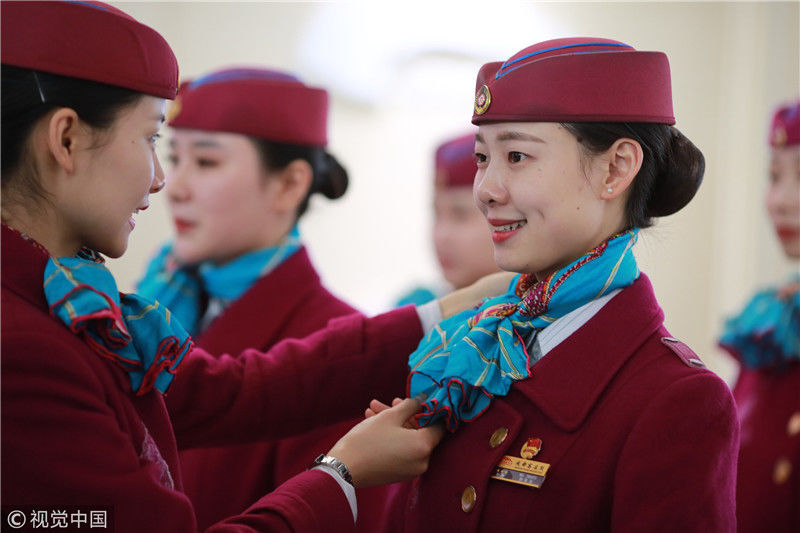 2018年12月27日,四川成都,為備戰(zhàn)即將開(kāi)通的成雅鐵路,中國(guó)鐵路成都局集團(tuán)有限公司成都客運(yùn)段動(dòng)車(chē)二隊(duì)對(duì)成雅動(dòng)車(chē)的乘務(wù)人員進(jìn)行理論、形體、服務(wù)禮儀等內(nèi)容的培訓(xùn)。蘇志剛/視覺(jué)中國(guó)