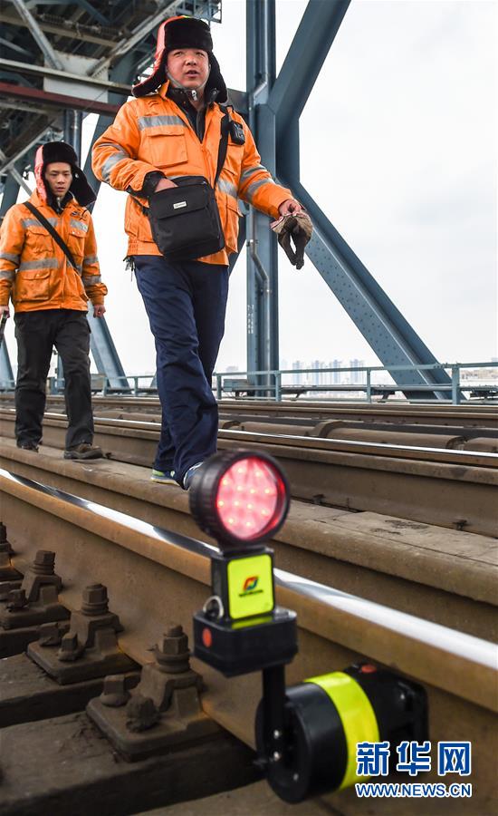 鄭煒(右)和工友在南京長(zhǎng)江大橋鐵路橋上進(jìn)行日常巡查(12月27日攝)。
