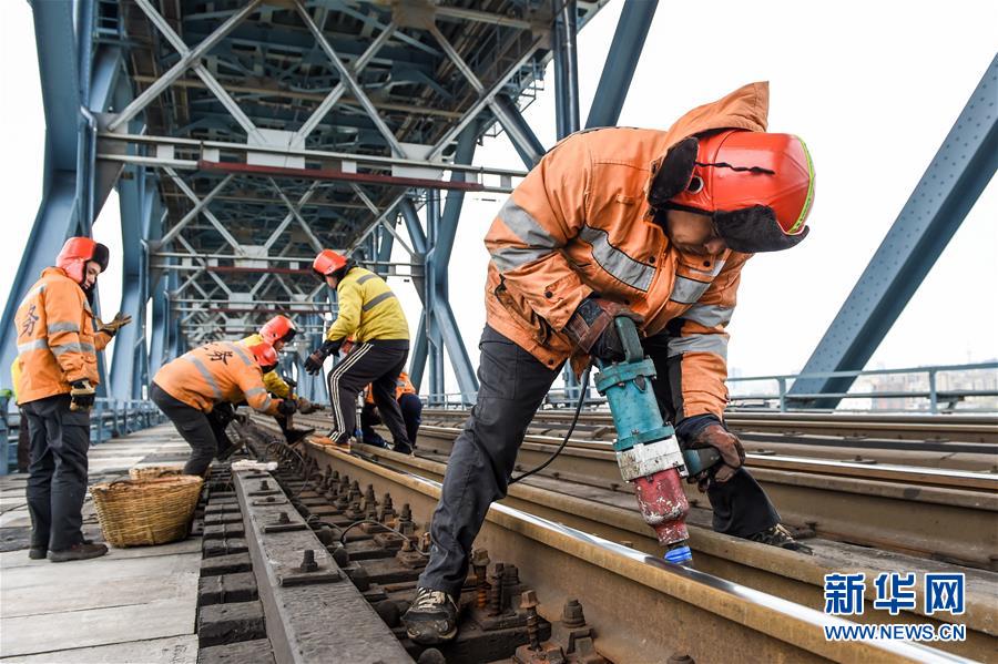 線路工們在南京長江大橋鐵路橋進行木枕改道作業(yè)(12月27日攝)。
