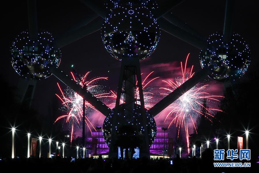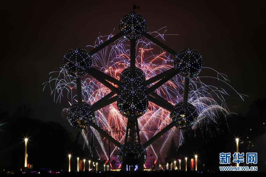 1月1日,比利時(shí)首都布魯塞爾的地標(biāo)性建筑——原子球塔附近煙花綻放。 新華社記者鄭煥松攝
