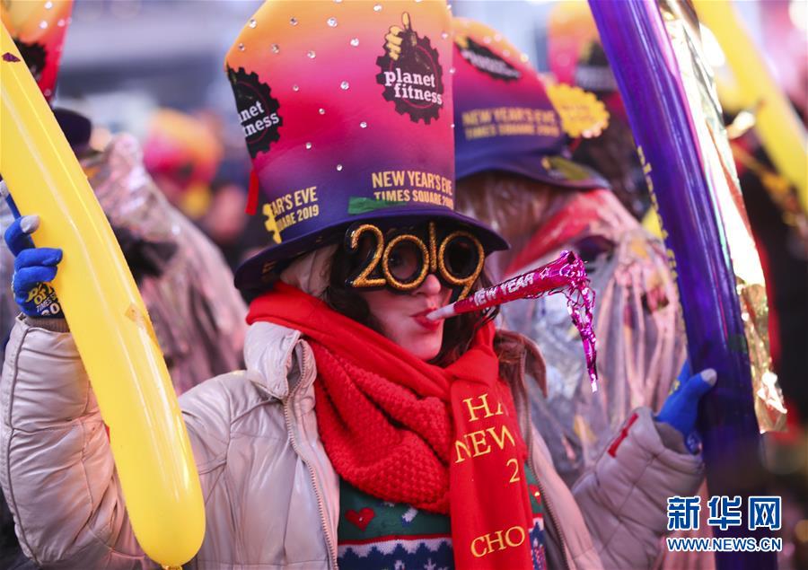 1月1日,在美國紐約時(shí)報(bào)廣場,一名女子參加跨年活動(dòng)。 新華社記者王迎攝