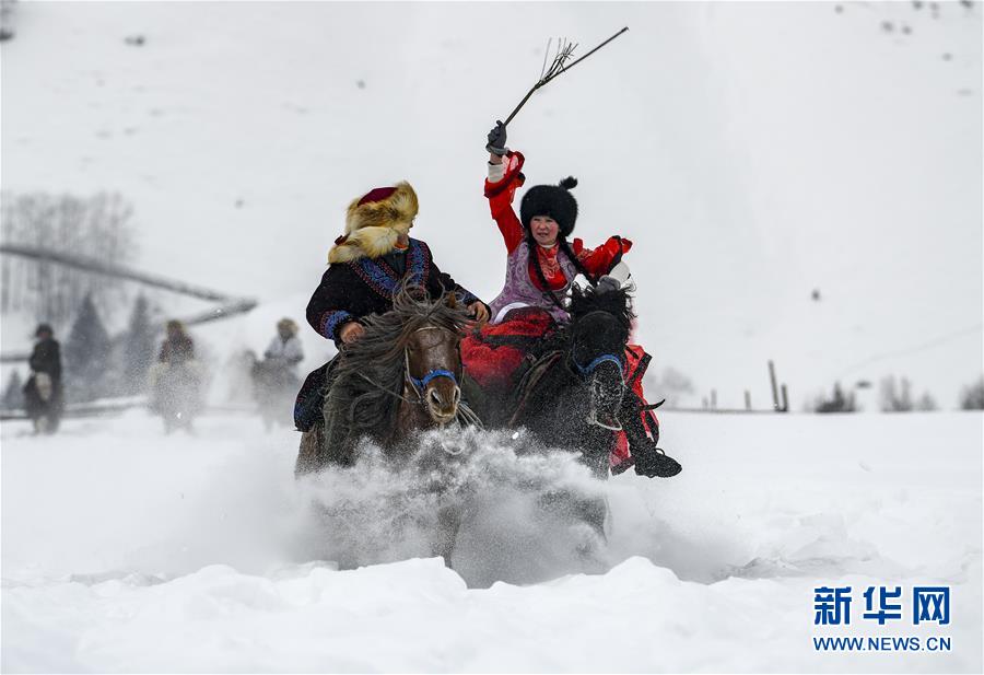 1月1日,在新疆禾木雪鄉(xiāng),當(dāng)?shù)鼐用癖硌荨把┑毓媚镒贰薄?/p>