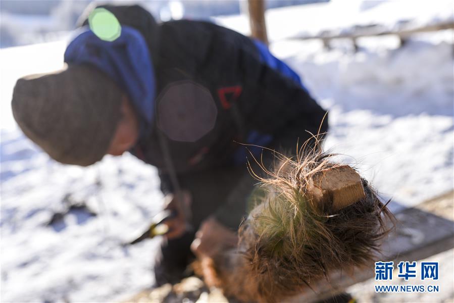 森格爾在新疆布爾津縣禾木村的一處冬季牧場(chǎng)制作毛皮滑雪板(1月3日攝)。 新華社記者 胡虎虎 攝