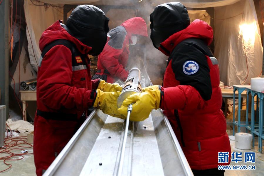 科考隊員處理鉆取的2.8米長冰芯(1月12日攝)。 新華社記者 劉詩平 攝