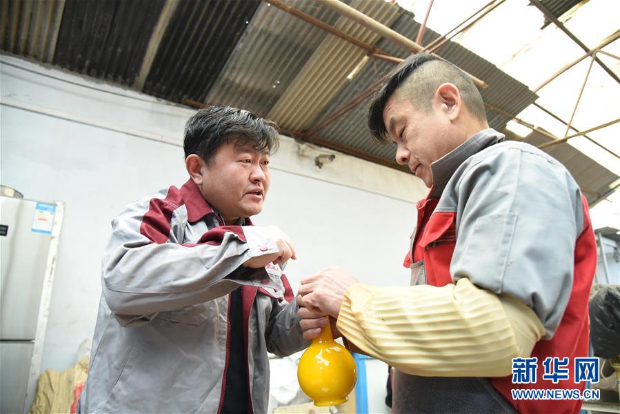 1月12日,孫云毅(左)在和工人交流一只雞油黃琉璃藝術(shù)品的打磨工藝。 新華社記者王凱攝