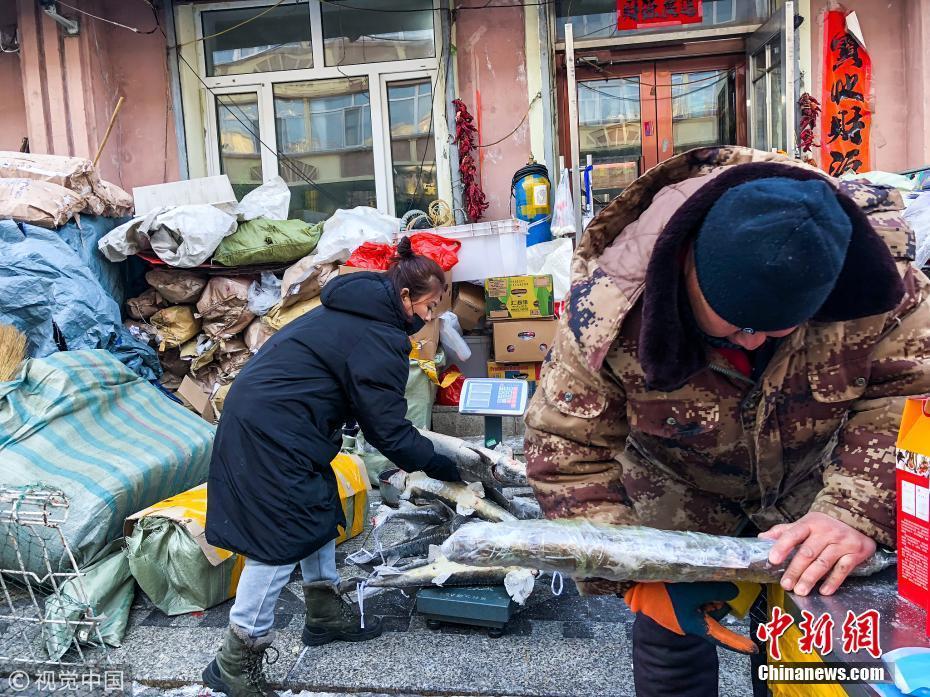 1月12日,黑龍江省佳木斯市撫遠(yuǎn)東極魚(yú)市,商戶在整理凍魚(yú)。棋簿紫 攝 圖片來(lái)源:視覺(jué)中國(guó)