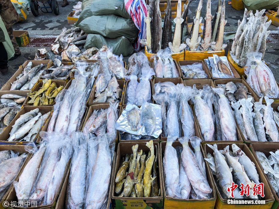 1月12日,黑龍江省佳木斯市撫遠(yuǎn)東極魚(yú)市,撫遠(yuǎn)東極魚(yú)市的凍魚(yú)。棋簿紫 攝 圖片來(lái)源:視覺(jué)中國(guó)