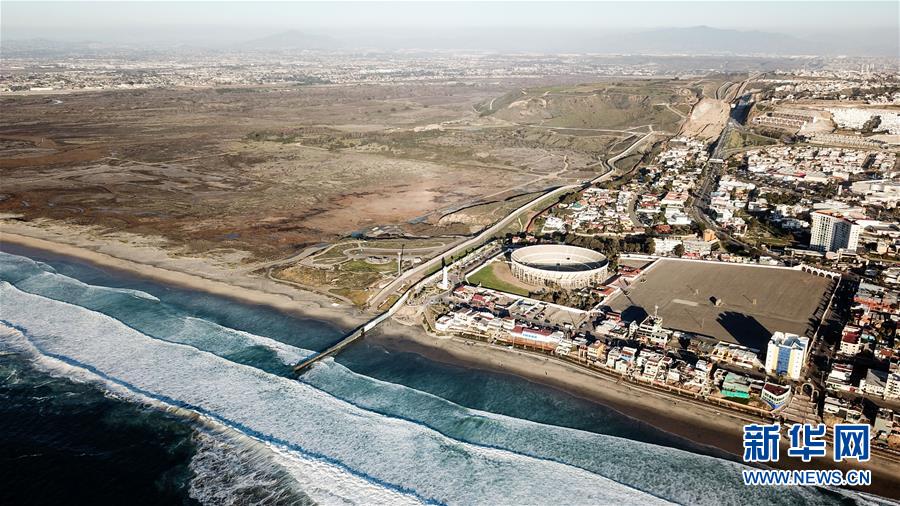 這是1月10日在墨西哥邊境城市蒂華納航拍的美墨邊境墻。畫面左側(cè)為美國(guó),畫面右側(cè)為墨西哥。 新華社記者 辛悅衛(wèi) 攝
