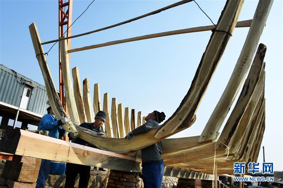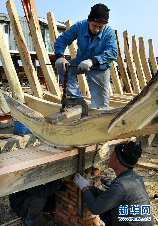 在青島紅雙木造船廠,幾位造船師傅在安裝船肋骨(1月10日攝)。新華社記者 李紫恒 攝
