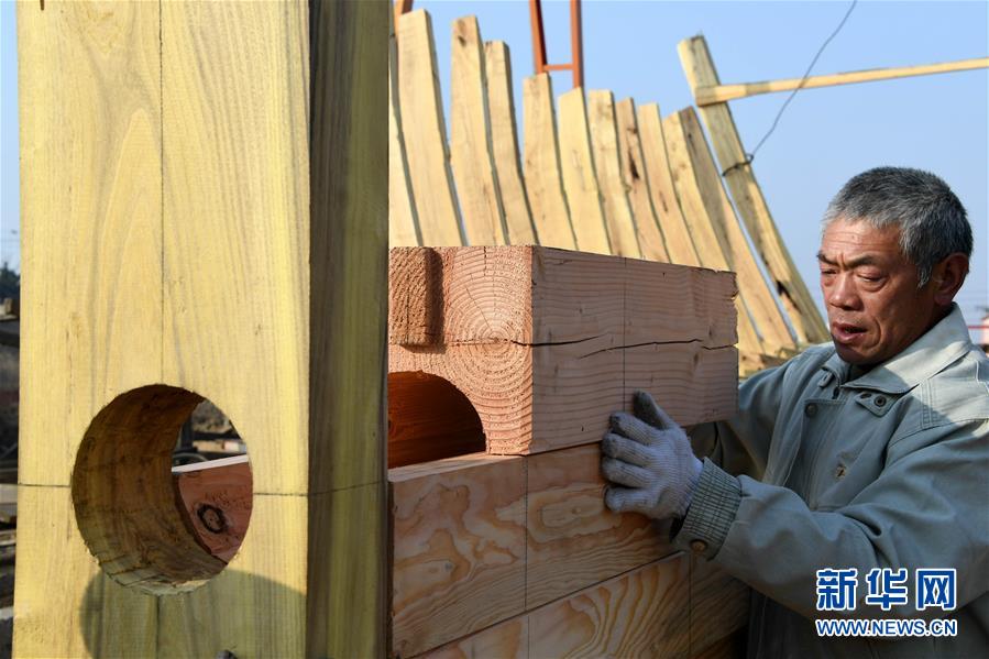 在青島紅雙木造船廠,一位造船師傅在加工構(gòu)件(1月10日攝)。新華社記者 李紫恒 攝