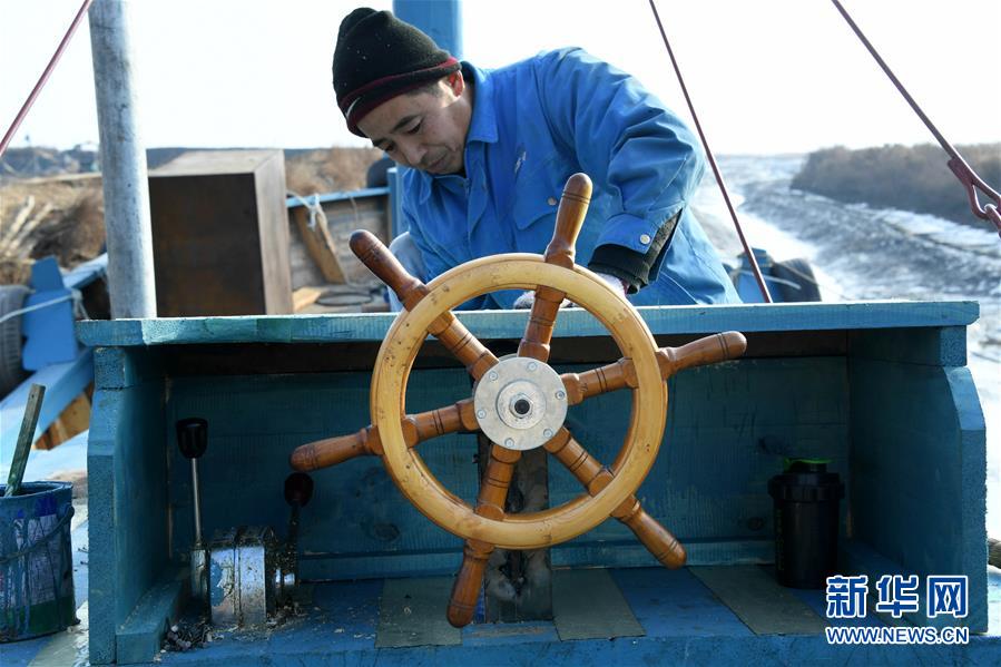 在青島紅雙木造船廠,一位造船師傅在檢查安裝加固龍骨(1月10日攝)。新華社記者 李紫恒 攝