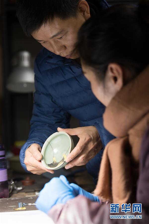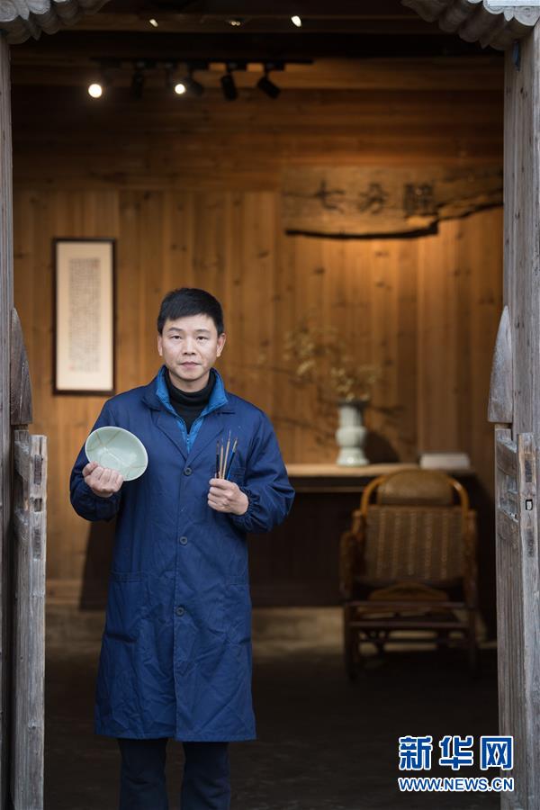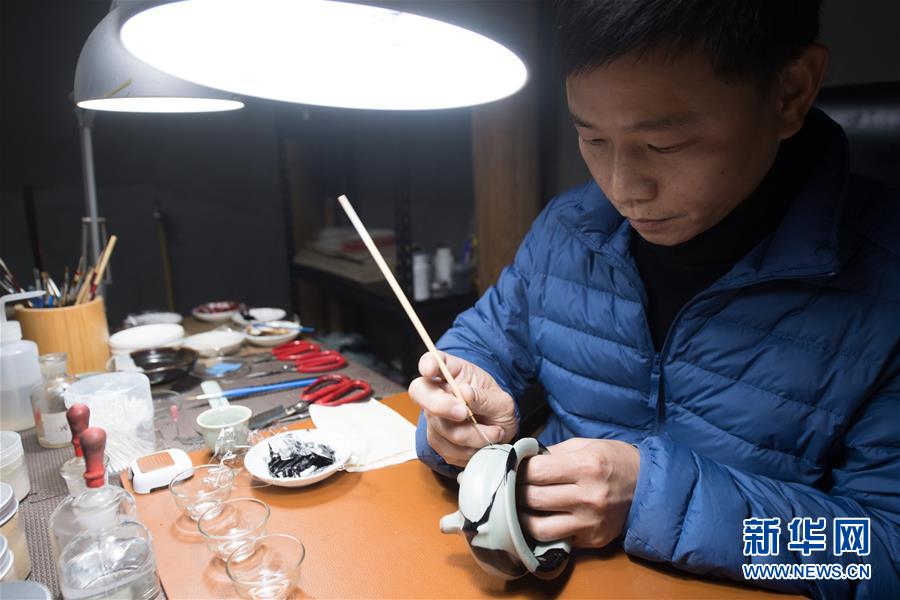 1月15日,吳榮強(qiáng)在龍泉市牛頭嶺村“七分醉”工作室對一件青瓷器皿進(jìn)行漆繕。 新華社記者翁忻旸攝