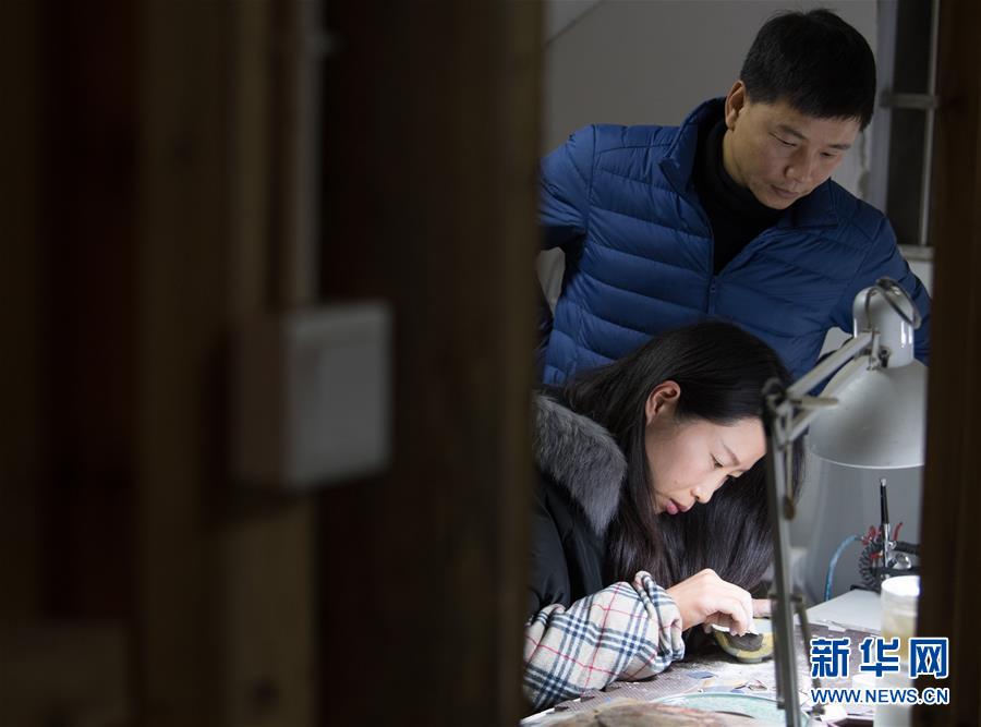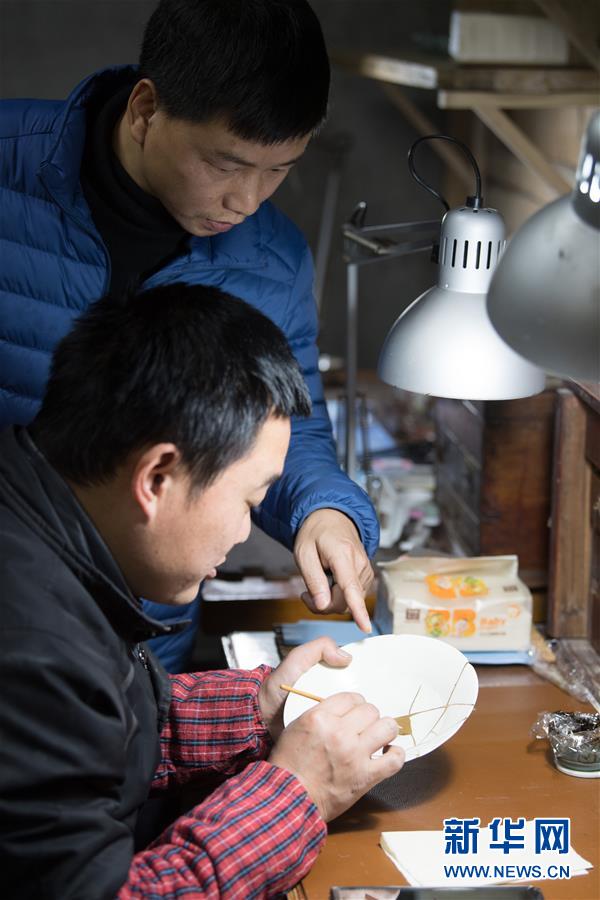 1月15日,在龍泉市牛頭嶺村“七分醉”工作室,吳榮強(qiáng)(上)指導(dǎo)一名徒弟進(jìn)行漆繕。 新華社記者翁忻旸攝