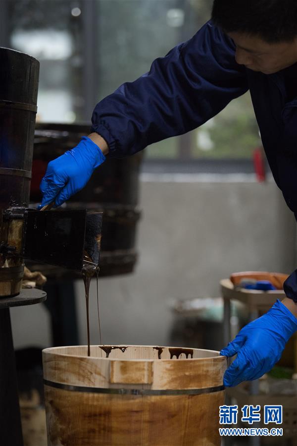 1月15日,吳榮強(qiáng)在龍泉市牛頭嶺村“七分醉”工作室濾漆。 新華社記者翁忻旸攝