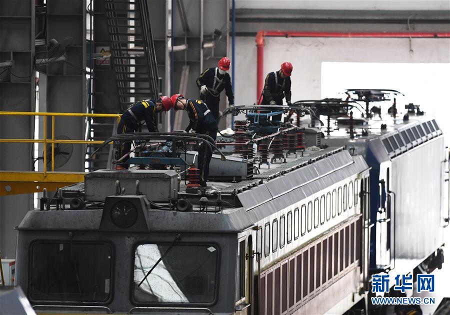 1月16日,重慶機務(wù)段職工在對機車車頂設(shè)備進行檢修。 臨近春運,為確保春運旅客和貨物列車運輸安全,中國鐵路成都局集團有限公司重慶機務(wù)段對全段機車進行專項檢查、整修,為即將到來的春運做準備。 新華社記者王全超攝