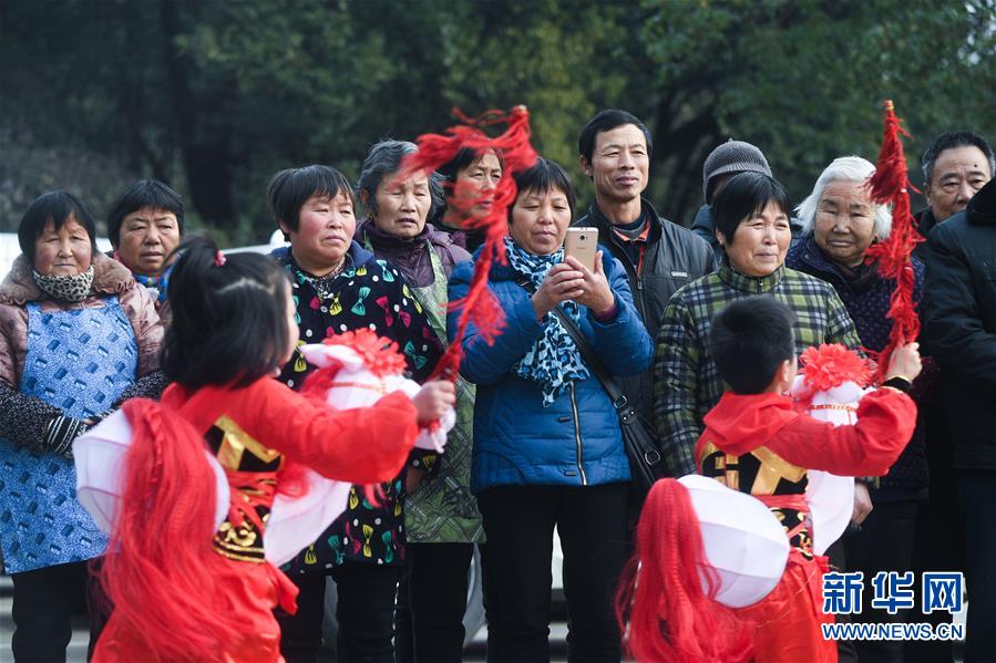 1月16日,新塘村村民觀看傳統(tǒng)非遺項(xiàng)目——下箬馬燈。下箬馬燈是發(fā)源于長興縣的民間舞蹈,距今已有1000多年歷史。 臨近春節(jié),浙江省長興縣開發(fā)區(qū)中心幼兒園的老師和孩子們來到長興縣太湖街道下屬的新塘村,為村民表演文藝節(jié)目,用喜慶的傳統(tǒng)舞蹈營造節(jié)日氣氛。另外孩子們還用紙盒、瓶子、彩色包裝紙等廢舊物品制作了環(huán)?;?,送給村民,倡導(dǎo)低碳環(huán)保的節(jié)日新風(fēng)。 新華社記者 徐昱 攝
