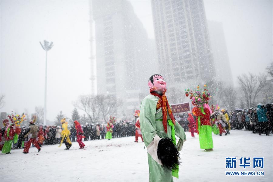 2月16日,社火隊演員在青海省大通回族土族自治縣文化廣場表演。