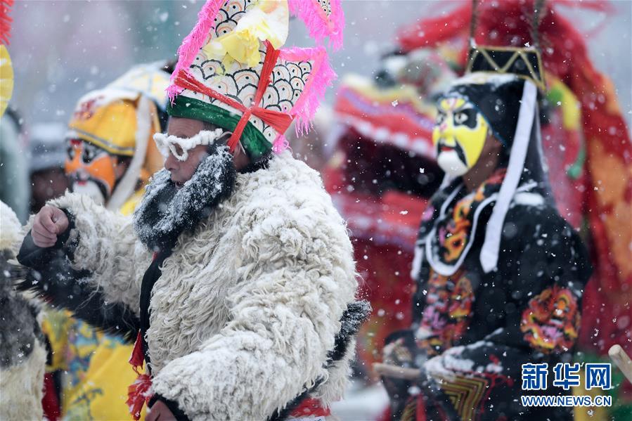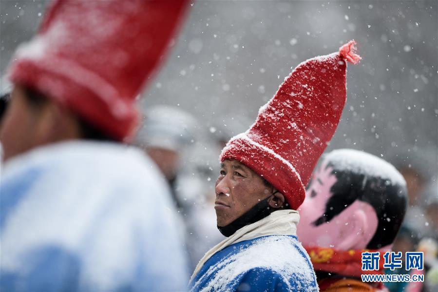 2月16日,群眾在青海省大通回族土族自治縣文化廣場冒雪觀看社火表演。新華社記者吳剛攝