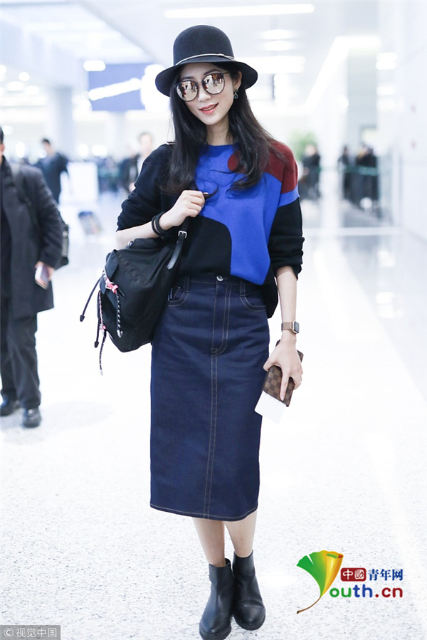 3月4日,上海,韓雪現(xiàn)身機(jī)場。她戴著圓帽和鐳射墨鏡,身穿拼色毛衣,盡顯優(yōu)雅名媛范。