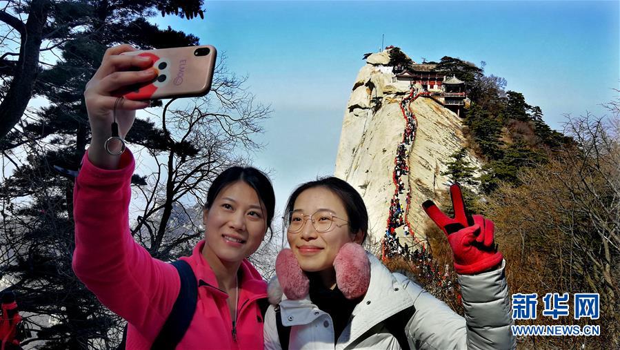 3月9日,游人在華山游覽拍照。 隨著氣溫回升,陜西著名風(fēng)景區(qū)華山進(jìn)入旅游旺季。 新華社記者 陶明 攝