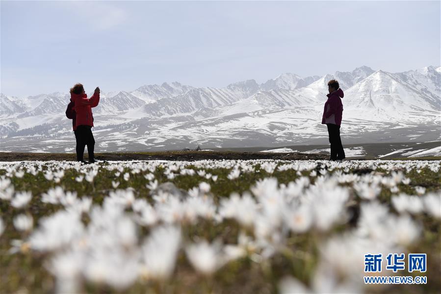 4月4日,游客在新疆那拉提景區(qū)雪山腳下盛開的野百合中拍照。新華社記者 沙達提 攝