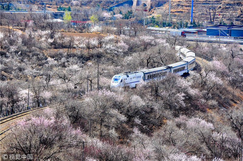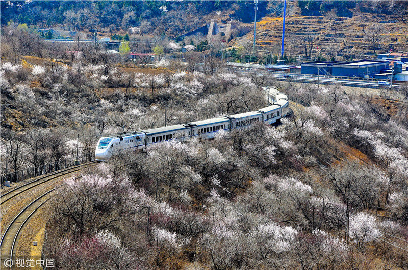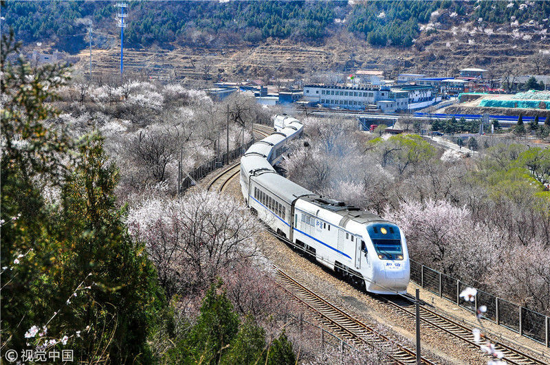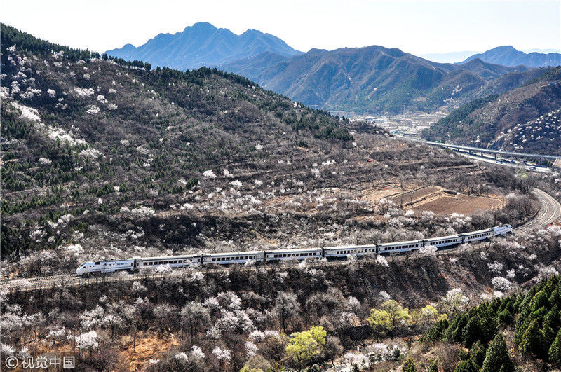 2019年3月22日,北京居庸關(guān)附近的山花盛開,S2線列車穿行在花海之中,構(gòu)成一幅美麗的畫面。時(shí)永平/千龍圖像/視覺中國 編輯/陳進(jìn)