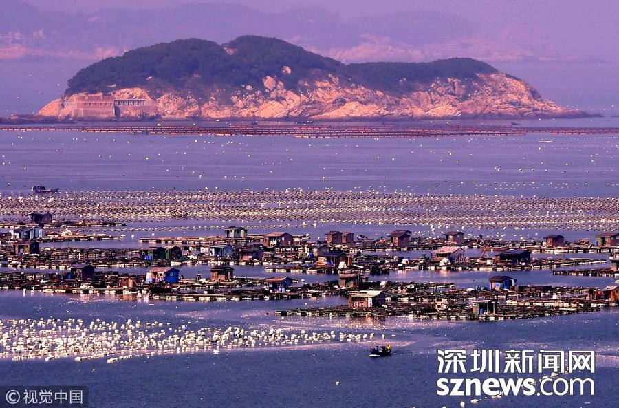 2018年10月26日,在福建連江海域上,“海上田園”網(wǎng)箱羅列,漁排上搭建的木屋錯(cuò)落成“戶”,蔚為壯觀,成為一道獨(dú)特的風(fēng)景線。福建省連江縣是中國(guó)鮑魚養(yǎng)殖第一大縣。